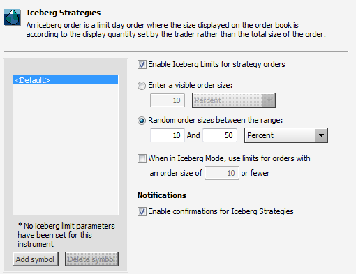 In order to place Iceberg strategy orders, you must select the Enable check box.