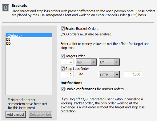 To receive confirmations related to bracket orders, click the Notifications check box. The confirmation allows you to disable either the target order or the stop loss order, so that a single order is triggered rather than an OCO (both target and stop loss).