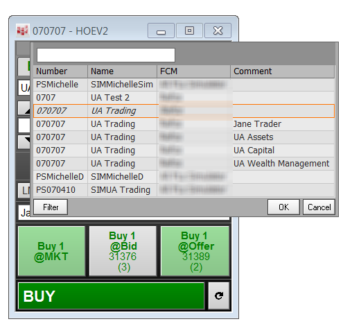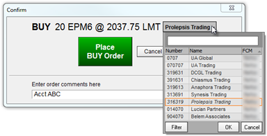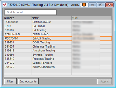 Account Picker is used to change accounts on order entry and order management applications: DOMTrader, Order Desk, Order Ticket, Quote SpreadSheet, SnapTrader (through Order Book), Spreadsheet Trader, and Orders and Positions.