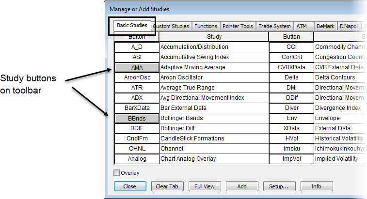 To add a study button to the toolbar, click the Studies button, then click the study button you want to add. You can also use Toolbar Manager.