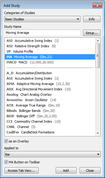 right-click the chart, then click Add Study to open the Add Study window