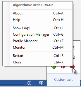 The TWAP application runs in the background of the CQG software. The TWAP icon is visible in the system tray when it’s running.