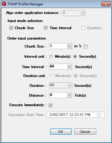 If you place a market TWAP order, the distance parameter is ignored and the application places market orders using the specified chunk size at the specified time intervals.