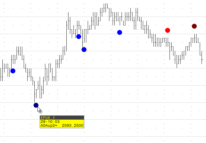 •Buy alert (Up1) = solid blue circle, located below the bar