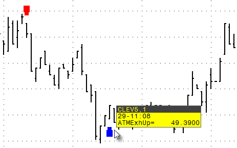 The ATM Exhaustion Alert is designed to locate potential short term contra trend tops and bottoms. It is represented by a box positioned blow a bar for a buy alert and above the bar for a sell alert.