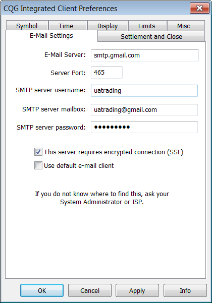 If you want emails sent using your own email application, then check this box. Automatically sent emails, such as alerts and auto-run market scans, will always be sent via CQG because of anti-spam limitations. |