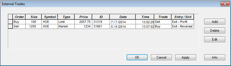 You can incorporate independent external positions into the active auto trade system by entering them on the External Trades window.