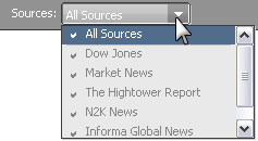 2.  Click an individual news source, such as Dow Jones, or click All Sources. Headlines for stories from that source are displayed in the story list.