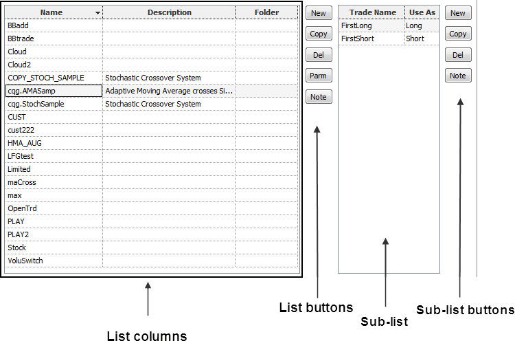 Each list has columns for the name, description, and folder location of each formula. QFormulas and Custom Studies have an additional column. Each list also has associated buttons. Custom Studies and Trade Systems have sub-lists.