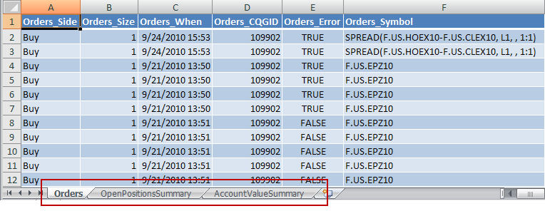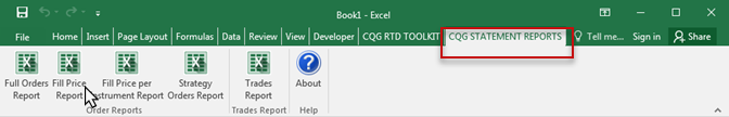 You can add reports, like Fill Price and Trades, using the CQG Statement Reports add-in. This image is from Excel 2016.