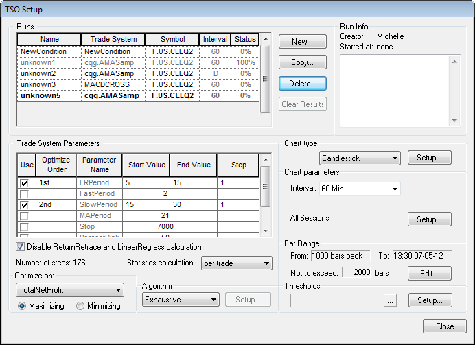 •To create a new run, cllick the New button. Enter a name for the new run and click OK. The TSO Setup window clears the Trade System Parameters section, and retains the last run's other settings, which you can either use as-is, or change.