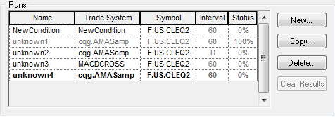 •To copy a previous run, click the New button to open the Copy a Run window. Enter a name for the new run and click OK. The TSO Setup window clears the Trade System Parameters section, and retains the last run's other settings, which you can either use as-is, or change.