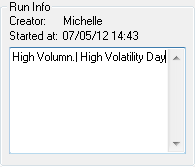 On the right side of the Runs section, under Run Info, you can type in information that is associated with the selected run. Additionally, this section lists the creator and time of the run. This field is displayed only on the TSO Setup window; it is not associated with the Note column in the TSO Results table. The Run Info area gives you a place to store information about the settings, parameters, values, or other characteristics that make this run unique.