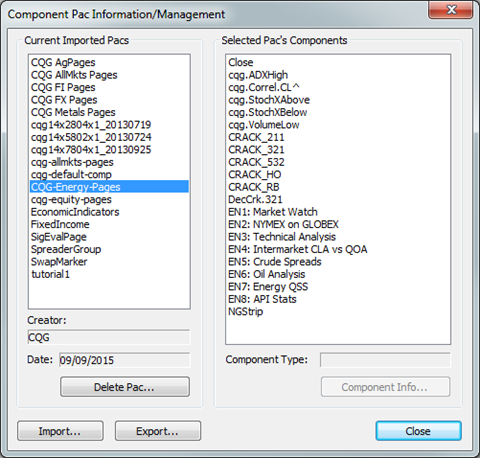 You can import and export various elements of your system by using pacs. You can export a pac to back up your system, move data from an old system to a new system, or share your setup with another CQG IC user. That user would then import that pac. Note that the Alert, Market Scan, Signal Evaluator, and Strategy windows cannot be exported.