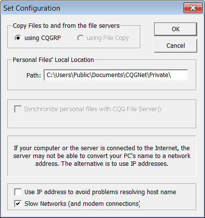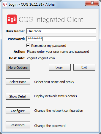 Click the More Options button on the Login window to expose advanced options. With the exception of changing your password, these options are used primarily when you’re working with CQG support.