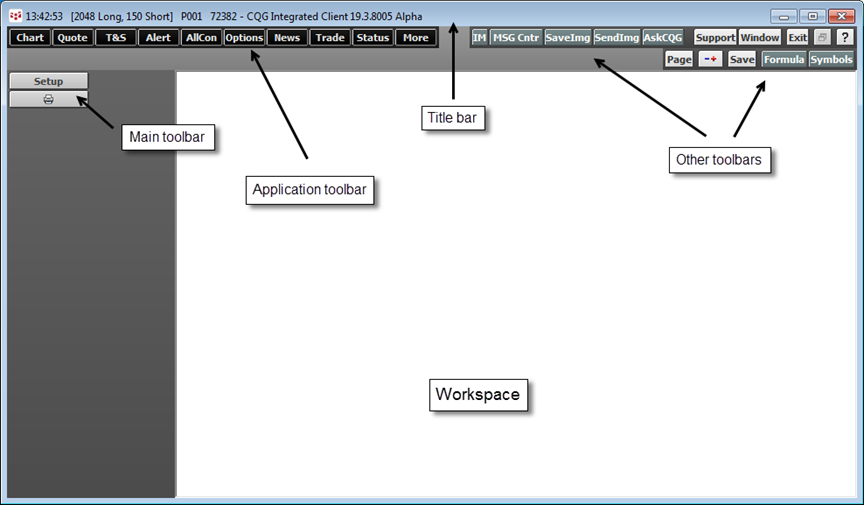 After you have successfully logged on, the Main window opens. Think of the Main window as your workspace, a place to arrange various windows, such as charts, quote boards, and trading applications.