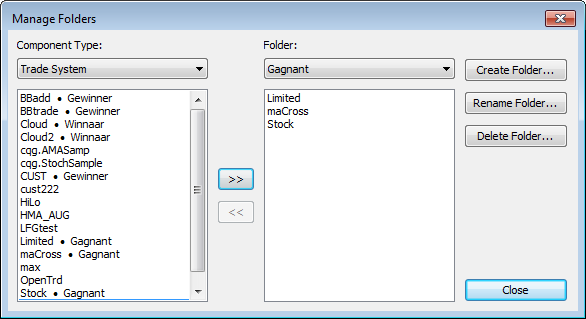 7. When you are finished adding formulas to folders, click Close. Formulas in a folder must all be of the same type, that is, you cannot have a folder with both Trade Systems and Conditions.