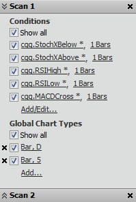 The scan area shows the conditions and chart types that are being used in each scan.