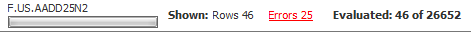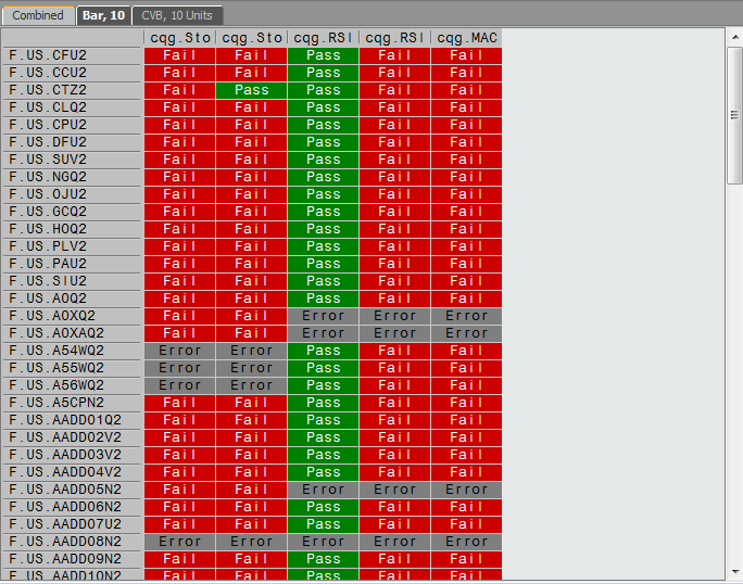 At the top of the Market Scan window, the status of the scan is displayed. The status includes a status bar indicating how far into the list of symbols the scan is and the current symbol being scanned. The Evaluated field displays similar information numerically. The number of rows is displayed. The Errors link indicates the number of errors so far in the scan. Clicking that link opens the Error Log window.
