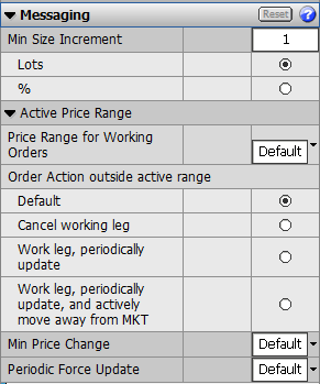 Price Range for Working Orders: Defines the range (from best bid/best offer whichever is closest) where orders are actively worked in ticks. Values: Default = do not override server setting Off = no limit 0 = best bid/offer only 1-10, 20, 30 |