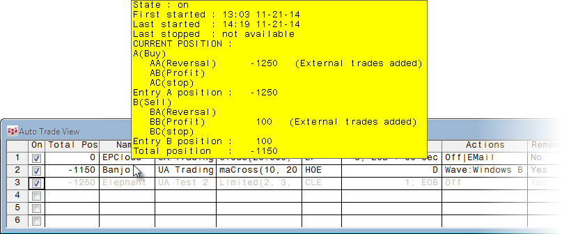 Orders can be monitored in real-time by applying the ATS study, which shows P&L and other performance statistics of actual orders since the start of the auto trade or some other time that you specify.