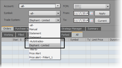 Monitor autotrading on Orders and Positions by filtering the view for Auto Trade only, using the Trade System drop-down menu.