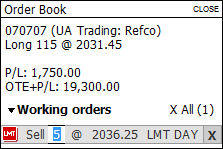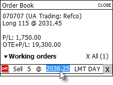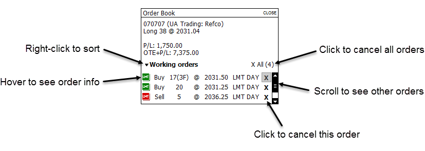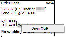 Order Book displays account, position, OTE & P/L, and open order details for the chart symbol. Order Book displays all open orders for that symbol, including orders placed using other trading applications.