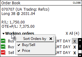 Right-click Working orders to open the sorting menu. If both options are selected, orders are first sorted by buy and sell and then by price. Buy orders are followed by sell orders. Price is sorted from highest to lowest. If orders are not sorted, they are listed chronologically, most recent order first.