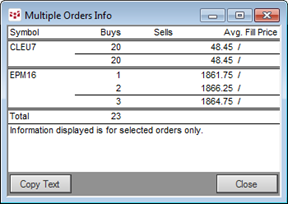 The Multiple Orders Info window opens and displays buys, sells, and average fill price by symbol for the select orders. This window works dynamically with Order and Positions; that is, if you change the selected rows on Orders and Positions, the information in the Multiple Orders Info window changes too.