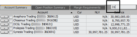 Select All FCMs or All Accounts on the Account pane, then press Ctrl+F to move directly to the filter field. You can also press Ctrl+F from the Account Summary window to move to the filter field.