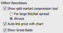 Choose whether to display the split market compression button. This tool compresses prices between the best bid and best ask, which is useful for markets with a large gap between those prices. You can choose whether to show it all the time or only when necessary. |