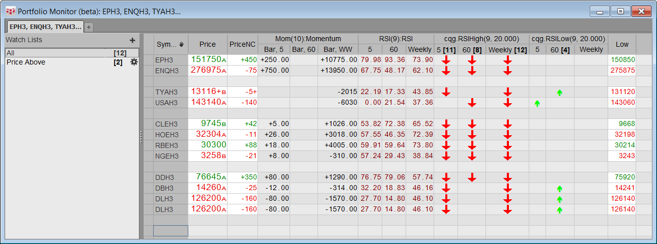 The watch list provides a way to filter column values based on study and condition values. Additionally, on Spreadsheet Trader, you can create watch lists to filter symbols, so that only symbols with working orders or open positions are displayed; you can display only those symbols that have volumes that fall within a particular range.