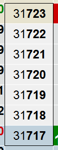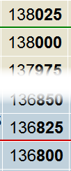 Every fourth row is shaded for decimal tick size of 25/100 and tick sizes: 1/4, 1/8, 1/16, 1/32, 1/64, 1/128, 1/256, 1/512, 1/2 of 1/64, 1/8 of 1/32, 1/4 of 1/32, 1/2 of 1/32. Every fifth row is shaded for decimal tick size. In the case of fraction A/B or A/B of 1/C: •If B is less than 7, then every Bth row is shaded. •If B is greater than 7 and divisible by 5, then every 5th row is shaded. •If Bth is greater than 7 and not divisible by 5, then every B row is shaded. |