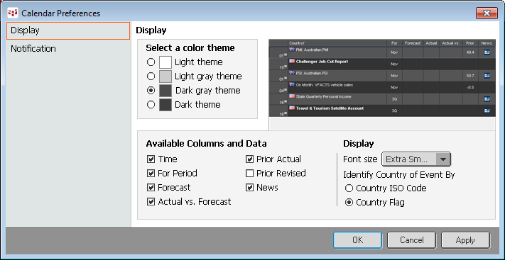 Select the columns to display on the calendar: Actual vs. Forecast, For Period, Forecast, News, Prior Actual, Prior Revised, and Time. |