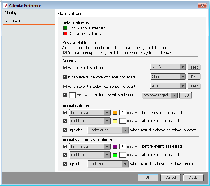 Turn on sound notifications for any of four situations: on event release, on event above forecast, on event below forecast, and some number of minutes before an event release. Select the sound from the drop-down menu. Several sound (.wav) files are provided for you. You may also select a .wav file from another source by clicking Browse in the drop-down menu. |