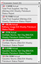 Turn on visual notifications for any of three situations: some number of minutes before an event, some number of minutes after an event, and when the actual is above or below forecast. For before and after, select the type of notification from the drop-down menu: highlight, progressive (before only, changes color progressively), or blink. Click the colored square to open a standard color palette. For above or below forecast, select background or text. (The text color is determined in Color Columns preferences.) In the following image, notice the arrow button at the bottom of the Actual column. Click this button to move to the next notification.