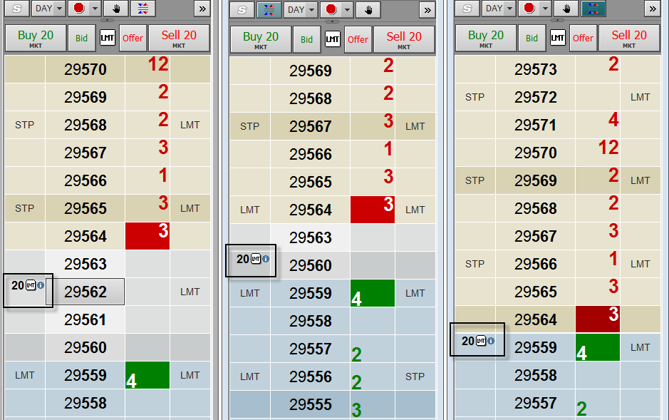 When the DOM is compressed, orders are displayed at the nearest available price. Hover the mouse over the order to display order details. For example, an order was placed at 29562 on the uncompressed DOM ladder: