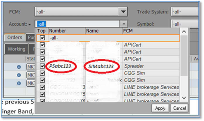 TIP: In order to find the correct string to enter for the account you want to use, you can go to your “Orders and Positions” window in IC and browse the accounts from the account filter dropdown: