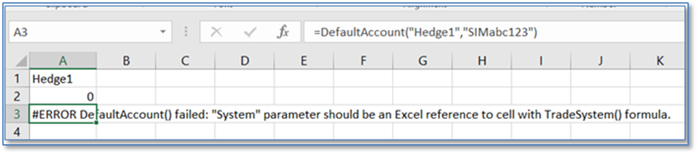 You can use either the “Number” or the “Name” for your account parameter. If entered correctly, after exiting that cell the function will display the account. If we had entered our parameters incorrectly, we would get an error in this function cell instead, such as when we try to enter the system name explicitly as a string rather than as a “cell reference” as it expects: