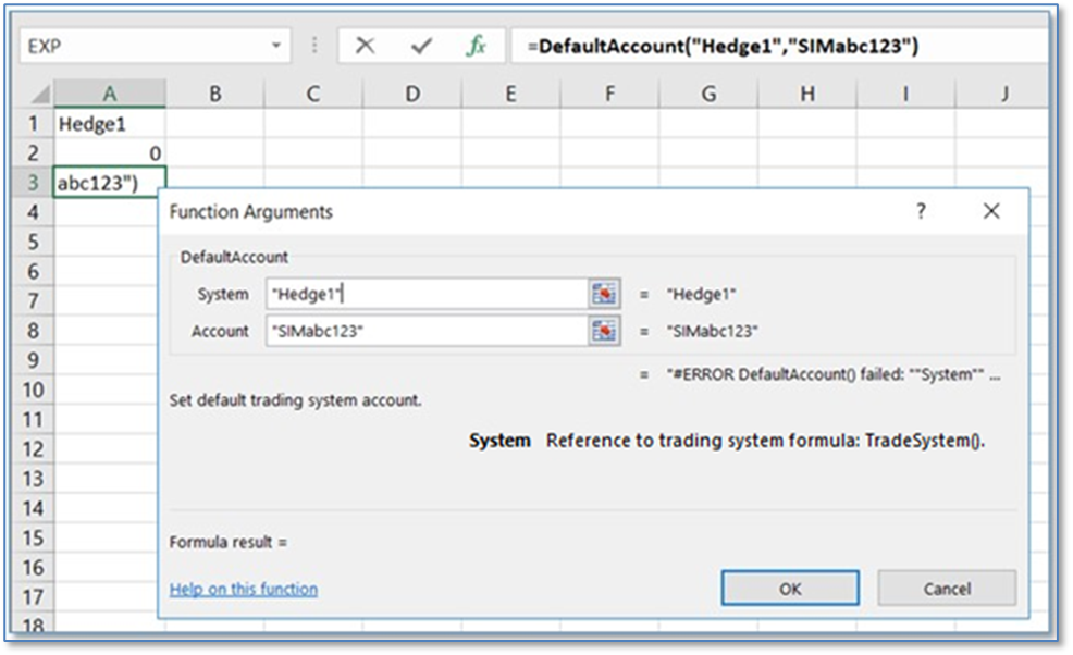 In our example, I have entered cell A1 for the system parameter, and given “SIMabc123” for the account parameter.