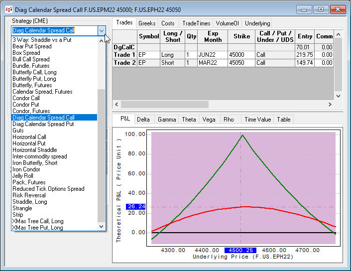 In CQG, UDS are built in to Strategy Analysis (on the Strategy drop-down menu). The menu includes several common strategies as well as strategies that are not tradable (such as covered UDS). You can also create custom UDS.