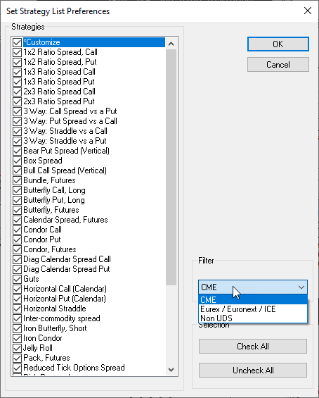 The strategy abbreviation is used as part of UDS expression (strategy formula). Then next three tables detail the strategies available by the exchanges, which are chosen from the Setup/Customize Strategy List/Filter