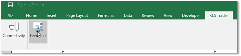 Once installed, XLS Trader appears on the Command Bar. There are two features: Connectivity and Feed Back.