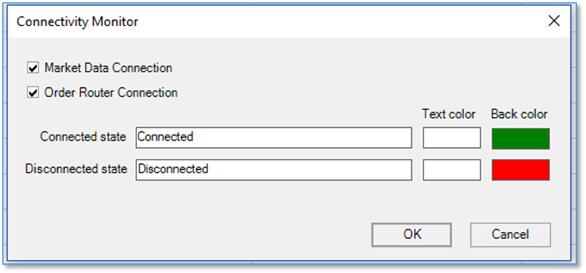 “Connectivity” uses the =IsMarketDataConnected()+IsOrderRouterConnected() functions in a cell and if they are true you see connected. You can use a formatting of your choice.
