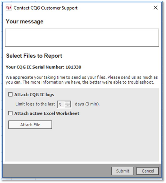 If you select Feedback, you will see this dialog below. Fill in the issue in “Your Message” box, check off attach the Excel spreadsheet and check off attach logs. Providing screen captures will be very helpful by clicking attach files and browsing to the file. CQG considers your work to be proprietary and will not be shared.