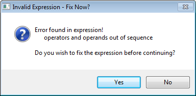 Click No to fix the expression later. Once you click no, the system validates that formula only if you change it, click the Apply button, or use it in an application.
