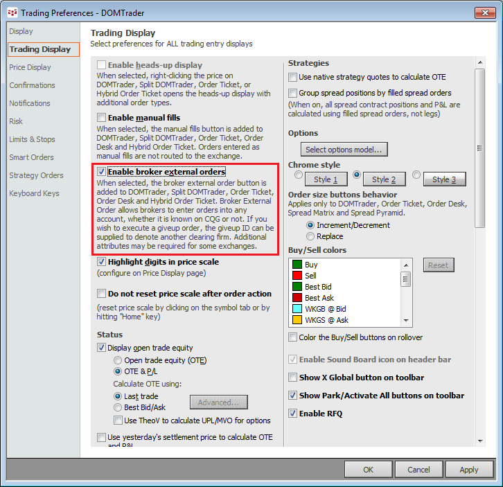 In the CQG client, select ‘Enable Broker External Orders’ in Trading Preferences