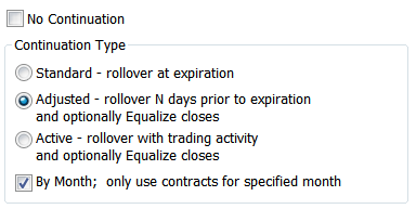 This option sets the chart to display data for the most active contract month. Once the transition occurs between the near-term month and the next month, the further out month remains the active contract until a contract other than that becomes more active. Colored horizontal bars appear at the bottom of the continuation charts, directly above the time scale, to indicate a transition to a new contract. Additionally, you can choose to equalize the closes by selecting Equalize Closes in the Rollover Adjustments section. This equalization is done by adding the difference between the old lead month and the new lead month to the historical data. Determining the Most Active Contract: The most active contract is determined by using tick volume (both daily and tick volume) or by using the near-term month, depending on the algorithm set by CQG. More specifically, for the "Fast" algorithm, the tick count must be 50% larger before the most active contract is changed. Most financial contracts use the fast algorithm. For the "Slow" algorithm, both the volume and the tick count must be at least 10% greater in the next month than the currently most active month for the new contract to take over as the most active. Generally, the non-financial contracts, especially the grains, use the slow algorithm since the new crop may see significant activity, even when it is not the front month. Additionally, short-term interest rate contracts use the slow algorithm. The near term month is used only for inactive contracts such as the EuroYen. Generally, rollovers occur at the end of the regular trading session. However, automatic rollovers can be over-ridden the following morning when conditions warrant. Equalizing the closes: Equalizing the closes makes the expiration comparisons more relevant. The equalization is applied on the day of the rollover (determined by the switch in the most active contract) according the following example: Example: On