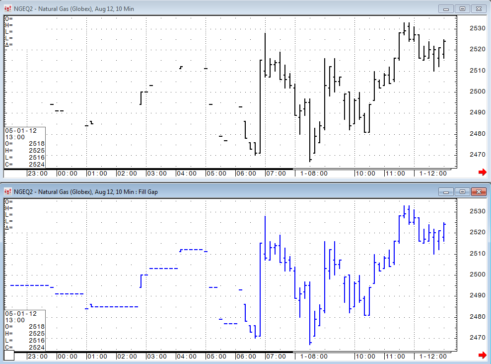 A Fill Gap chart fills in the time slots that have no activity using the previous bar's close as the open, high, low, and close for the bar with no activity.