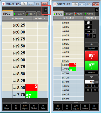 Additionally, HOT has buy and sell market buttons. Click a market button to place a market order. If you choose to add these buttons to the display, then market orders can be placed only by using those buttons.